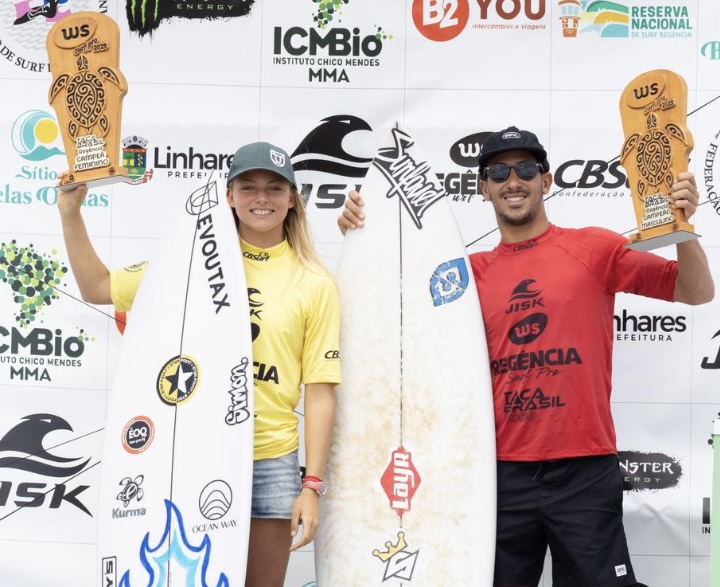 Os títulos da sexta etapa da Taça Brasil 2025 da Confederação Brasileira na Reserva Nacional de Surf do Espírito Santo vão para São Sebastião (SP) Os títulos do JISK apresenta CBSurf Taça Brasil WS Regência Surf Pro na Reserva Nacional de Surf de Linhares, no Espírito Santo, vão para São Sebastião, no litoral norte de São Paulo. A jovem Mayara Zampieri, 17 anos, e Renan Pulga, 27, foram os campeões da etapa inédita da Confederação Brasileira de Surf no pico da Reserva Biológica de Comboios na Praia de Regência. Os vice-campeões foram o também paulista da mesma Praia de Camburi, Pedro Dib, e a cearense Juliana dos Santos, ambos com 25 anos. Em terceiro lugar ficaram o potiguar Kayan Medeiros, 22, e a baiana Sol Carrion, 20. E os quartos colocados foram o paranaense Anuar Chiah, 16, e a capixaba Alice Pitanga, de apenas 15 anos de idade. “Estou muito feliz. Eu nunca tinha vindo pra Regência e gostei muito desse lugar. Tem altas ondas”, enalteceu Mayara Zampieri, no pódio da primeira vitória em competições profissionais. “Eu fui passando as baterias, acabei chegando na final e estava esperando esse título faz um tempo. Estou muito feliz de ter conseguido agora”. Tanto Mayara Zampieri, como Renan Pulga e o vice-campeão, Pedro Dib, são da Praia de Camburi em São Sebastião e têm o mesmo técnico, como destacou o campeão: “Estar aqui dividindo o pódio com a Mayara (Zampieri) é incrível. A gente mora no mesmo lugar, treina junto com o mesmo treinador, o Dib é o meu melhor amigo e ficou em segundo, treina com a gente também, então nós conseguimos fazer uma parada histórica aqui”. Esta foi a terceira final seguida do Renan Pulga em etapas da Taça Brasil esse ano. Ele ficou em terceiro lugar na Reserva Nacional de Surf da Praia de Itamambuca, em Ubatuba (SP), domingo passado foi vice-campeão nas grandes ondas da Praia de Geribá, em Armação dos Búzios (RJ), agora é campeão do CBSurf Taça Brasil MS Regência Surf Pro apresentado por JISK. Com os 5.000 pontos da vitória, subiu da nona para a quarta posição no ranking que indica 8 surfistas para a elite dos top-22 da CBSurf no Campeonato Brasileiro de 2026. “Vencer é a melhor sensação do mundo competitivo. A gente vive por isso, treina pra isso e chegou minha vez”, disse Renan Pulga. “Bati na trave em algumas finais, ficando em segundo, terceiro e dessa vez consegui vencer, então é uma sensação de dever cumprido. Estou muito orgulhoso de mim, de tudo que a gente passa pra chegar aqui, as provações, os resultados ruins. Tem que ter a cabeça boa e são por estes momentos que a gente vive. Estou muito feliz e não vejo a hora de chegar em casa, ver minha família e levar esse troféu pra minha filha”. Enquanto Renan Pulga completou seis finais disputadas em etapas da Taça Brasil da Confederação Brasileira de Surf e só tinha vencido a primeira na Praia da Taíba (CE) em 2022, Mayara Zampierichegou em sua terceira decisão e já comemorou vitória no CBSurf Taça Brasil MS Regência Surf Pro. Ela também foi finalista na etapa encerrada no domingo passado em Búzios (RJ), onde ficou em terceiro lugar e tinha uma quarta posição na sua primeira final em Matinhos (PR) no ano passado. “Eu quero agradecer a Deus, primeiramente, e a minha mãe, que está sempre acreditando em mim, independente da situação. Eu posso estar no meu pior momento, ela sempre está acreditando que eu posso ser campeã, que posso vencer e que sempre posso melhorar. Então, eu quero dedicar esse título para ela”, ofereceu Mayara Zampieri, que entrou na lista das 4 surfistas que a Taça Brasilclassifica para a elite das top-11 da CBSurf no Campeonato Brasileiro de 2026. RECORDES FEMININOS NA PRIMEIRA DECISÃO DO DOMINGO EM REGÊNCIA Na decisão da primeira vitória da sua carreira de surfista profissional que está só iniciando, Mayarafez os recordes femininos do CBSurf Taça Brasil Regência Surf Pro apresentado por JISK. Com um ataque vertical de backside na junção, ela ganhou nota 7,77 dos juízes para confirmar o título por 11,94 pontos na bateria liderada desde o início. A atual campeã brasileira, Juliana dos Santos, ficou em segundo na sua sexta final em etapas da Taça Brasil e reassumiu a ponta no ranking de 2025. As outras surfistas que subiram ao pódio no domingo, nunca tinham chegado nem em semifinais. A baiana Sol Carrion, que mora em Santos e ganhou o primeiro título paulista profissional feminino da história, ficou buscando os tubos na Praia de Regência e terminou em terceiro lugar. Já a estreante Alice Pitanga, de apenas 15 anos, não conseguiu achar boas ondas e ficou na quarta posição. Nas semifinais, Aliceavançou junto com Juliana dos Santos, barrando a surfista de Linhares e sua amiga de 13 anos apenas, Aninha Dagostini, e a carioca Sarah Ozorio. KAYAN MEDEIROS É O REI DOS TUBOS NA RESERVA NACIONAL DE SURF Nas semifinais masculinas, o potiguar Kayan Medeiros, que mora em Baía Formosa, cidade do campeão olímpico Italo Ferreira, se tornou o verdadeiro “Rei dos Tubos de Regência”. No sábado, ele tinha surfado o melhor da semana no pico da Reserva Biológica de Comboios, que ganhou nota 8,00. Com o vento terral mais forte no domingo, Kayan pegou um nas semifinais que rodou perfeito. Nesse, ficou mais entocado lá dentro e saiu limpo, para arrancar 9,50 dos juízes, maior nota do CBSurf Taça Brasil MS Regência Surf Pro apresentado por JISK. Kayan Medeiros ganhou dois óculos da Apolo Eyewear de prêmio, pela maior nota do sábado e do domingo, quando barrou o surfista capixaba Rafael Teixeira e o rasta baiano Junio Santo, na semifinal vencida por Renan Pulga. O campeão também estabeleceu um novo recorde de 16,23 pontos neste confronto, somando notas 8,40 e 7,83 com seu backside agressivo nas esquerdas de Regência. Na outra semifinal, seu amigo Pedro Dib e Anuar Chiah, derrotaram o pernambucano Cauã Nunes e o cearense Guilherme Lemos, que mora na cap