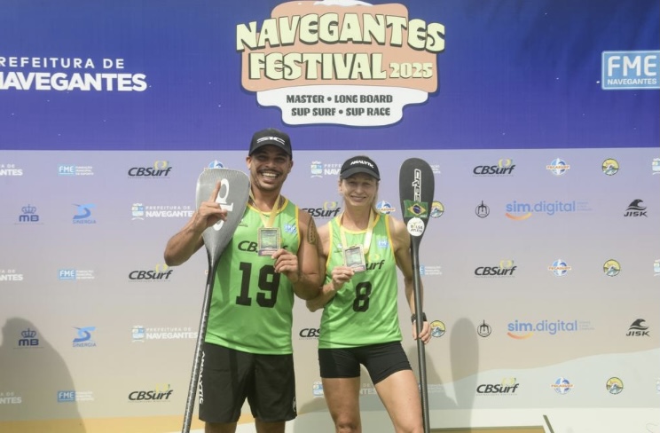 Assessoria de Imprensa da CBSurf:João Carvalho O baiano conquistou o pentacampeonato brasileiro e a paranaense festejou seu primeiro título na prova de velocidade realizada nos molhes do Rio Itajaí-Açu O CBSurf Navegantes Festival decidiu mais dois títulos nacionais da Confederação Brasileira de Surf na quinta-feira em Navegantes, Santa Catarina. Na primeira prova do Stand Up Paddle e a mais veloz, o baiano David Leão conquistou o pentacampeonato brasileiro e a paranaense Roseli Krepelfestejou seu primeiro título na categoria Sprint. A competição rolou nos molhes do Rio Itajaí-Açu e as vitórias valeram vagas para o Mundial de Stand Up Paddle da International Surfing Association (ISA). “É sempre bom estar se colocando em prova, puxando os limites”, disse o baiano de Itacaré, David Leão. “Apesar de ser o atual campeão mundial e brasileiro, é sempre um desafio pra gente estar tentando se superar. A atmosfera do lugar aqui, ajudou também a gente ficar ainda mais motivado. Eu adoro essas coisas dinâmicas, a emoção do Sprint, essa adrenalina, é muito bom. Me sinto muito confortável nesse ambiente e estou feliz por sair daqui vitorioso, sendo campeão brasileiro pelo quinto ano consecutivo como atleta profissional”. O campeão mundial na Dinamarca no ano passado, também falou sobre a escolha da comissão técnica do Stand Up Paddle na Confederação Brasileira de Surf, em mudar o local do Sprint do mar agitado da Praia Central, para o Rio Itajaí-Açu: “Foi muito bacana. Navegantes é um lugar que respira a cultura do mar, a gente vê muitas embarcações, tem a cultura da pesca e me identifico com essa atmosfera. É a minha primeira vez aqui e quero parabenizar o pessoal local, a organização do evento e foi muito gratificante estar aqui”, confessou David Leão. A paranaense Roseli Krepel é outro grande nome do Stand Up Paddle brasileiro. A vitória no CBSurf Navegantes Festival foi o primeiro título brasileiro que a competidora da cidade de Guaratuba conquistou na categoria Sprint. Mas, Roseli já representou o país no Mundial da ISA em Porto Rico e na França. Só que em outras duas categorias, a de Longa Distância em 10 Km e a Tecnica, que ainda serão realizadas em Navegantes nos próximos dias. “Foi uma prova bem gostosa. A gente estava na dúvida se seria no mar, aí apareceu essa oportunidade de ser aqui no rio e todo mundo conseguiu fazer uma boa prova”, disse Roseli Krepel. “Aqui é um lugar muito bom pro Sprint e estou feliz por garantir minha vaga no Mundial da ISA mais uma vez. Todas as meninas são muito boas e a final é sempre mais puxada. Mas foi uma honra participar dessa bateria com elas e estou muito feliz pela vitória”. DECISÕES DOS TÍTULOS DO SUP SPRINT NO CBSURF NAVEGANTES FESTIVAL Na categoria feminina do Sprint, foram realizadas duas baterias nas semifinais e a grande final. A campeã Roseli Krepel foi a mais rápida nas duas vezes que competiu no Rio Itajaí-Açu. Na decisão do título do CBSurf Navegantes Festival, a paranaense ganhou a medalha de ouro e a vaga para o Mundial da ISA, derrotando a paulista campeã brasileira Moah, que ficou em segundo lugar, com a catarinense Rebeka Brehmer em terceiro e a paulista Dani Paiva em quarto. Na competição masculina, foram disputadas sete corridas no percurso de 200 metros, sendo 100 metros desde a largada até dar a volta na boia e mais 100 metros na reta final até a chegada. Foram quatro baterias nas quartas de final, depois duas nas semifinais e a grande final. O pentacampeonato brasileiro do David Leão, foi conquistado com grande vantagem sobre os três concorrentes. O baiano foi o campeão do CBSurf Navegantes Festival, com o jovem Rudah ficando com a medalha de prata e o também carioca Cirano Ribeiro com a de bronze. O paulista Arthur Santacreu foi o quarto colocado na decisão do título, que fechou a categoria Sprint do Stand Up Paddle. Ainda restam ser definidos os títulos brasileiros do SUP Wave e do SUP Race Técnico e Longa Distância, além das seis categorias do Longboard nas ondas da Praia Central. O CBSurf Navegantes Festival 2025 é uma realização da Confederação Brasileira de Surf em parceria com a Federação Catarinense de Surf e Associação Navegantes Surf Clube. A decisão dos títulos brasileiros do Master, Longboard e Stand Up Paddle, acontece com patrocínio da Prefeitura de Navegantes através da Fundação Municipal de Esporte (FME) e apoio de Marco Surf Boards, Supermercados Koch, JISK, parafina Fu-Wax, MB Marketing & Eventos, Sinergia, Sim. CATEGORIA STAND UP PADDLE DO CBSURF NAVEGANTES FESTIVAL: RESULTADOS DO SPRINT NA QUINTA-FEIRA NO RIO ITAJAÍ-AÇU: DECISÃO DO SPRINT MASCULINO: Pentacampeão brasileiro: David Leão (BA) Medalha de Prata: Rudah (RJ) Medalha de Bronze: Cirano Ribeiro (RJ) 4.o lugar na final: Arthur Santacreu (SP) SEMIFINAIS – 1.o e 2.o avançam / 3.o=5.o lugar e 4.o=7.o lugar: 1.a: 1-David Leão (BA), 2-Rudah (RJ), 3-Helbert Silva (SP), 4-Luiz Guida (SP) 2.a: 1-Cirano Ribeiro (RJ), 2-Arthur Santacreu (SP), 3-Cavaco (SP), 4-Giuseppe Nunes (BA) PRIMEIRA FASE – 1.o e 2.o avançam / 3.o=9.o lugar e 4.o=13.o lugar: 1.a: 1-David Leão (BA), 2-Cavaco (SP), 3-João Neumann (SC) 2.a: 1-Arthur Santacreu (SP), 2-Helbert Silva (SP), 3-Luiz Martins (SP) 3.a: 1-Luiz Guida (SP), 2-Cirano Ribeiro (RJ), 3-Tiago Cordeiro (SP) 4.a: 1-Giuseppe Nunes (BA), 2-Rudah (RJ), 3-André Paiva (SP) DECISÃO DO SPRINT FEMININO: Campeã brasileira: Roseli Krepel (PR) Medalha de Prata: Moah (SP) Medalha de Bronze: Rebeka Brehmer (SC) 4.o lugar na final: Dani Paiva (SP) SEMIFINAIS – 1.a e 2.a avançam / 3.a=5.o lugar e 4.a=7.o lugar: 1.a: 1-Moah (SP), 2-Dani Paiva (SP), 3-Ana Quezia (SC) 2.a: 1-Roseli Krepel (PR), 2-Rebeka Brehmer (SC), 3-Scarlet Miranda (RJ)