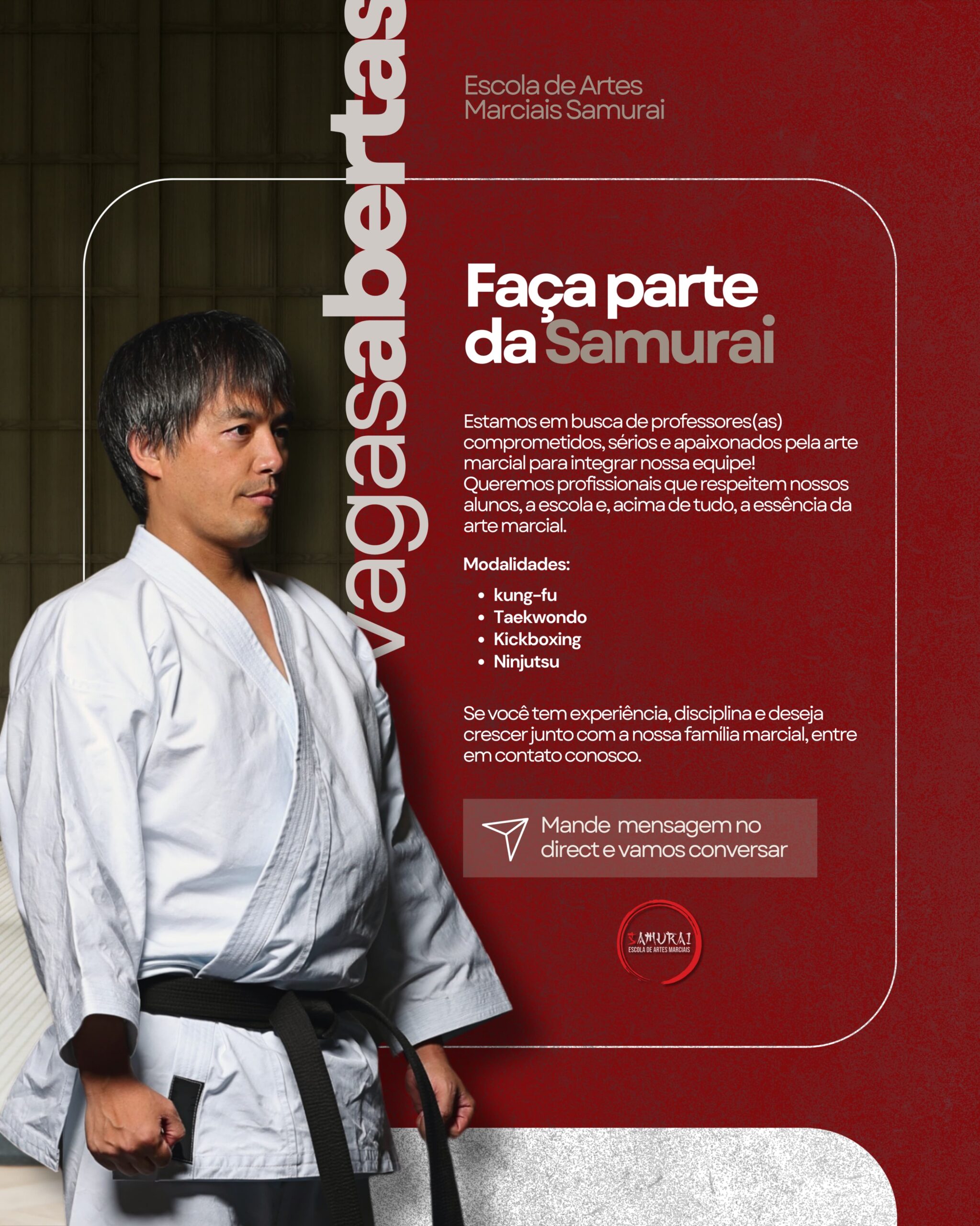 No tatame, o atleta busca superar seus próprios limites, conquistar medalhas, melhorar o desempenho físico e evoluir na técnica. Já o professor tem uma missão ainda maior: formar pessoas, transmitir valores, educar, inspirar e guiar cada aluno em sua jornada marcial e pessoal. Na Samurai – Escola de Artes Marciais, acreditamos que ser professor é mais do que ensinar golpes e técnicas: é transformar vidas através da disciplina, respeito e dedicação. Estamos em busca de professores comprometidos com a arte marcial e com o crescimento de nossos alunos. Se você tem experiência, responsabilidade e amor pelo que faz, venha fazer parte do nosso time. Modalidades em foco: Kung Fu | Taekwondo | Kickboxing Entre em contato e venha compartilhar seu conhecimento no tatame da Samurai