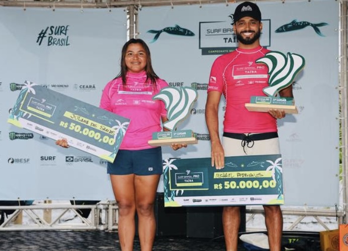 Os cearenses Michael Rodrigues e Juliana dos Santos venceram o Surf Brasil Pro em casa e largaram na frente na corrida pelos títulos brasileiros de 2026 na Praia da Taíba, em São Gonçalo do Amarante, no Ceará. Michael tem 31 anos, mora em Florianópolis (SC) e ganhou do paulista Wesley Leite, 30, vingando a derrota sofrida na final da etapa de Vila Velha (ES) em 2024. No feminino, a campeã brasileira Juliana dos Santos, 25 anos, confirmou o favoritismo sobre a jovem Analu Silva, 19, na primeira final da paraibana. O próximo desafio do maior encontro do surf brasileiro, será na Praia do Borete de 9 a 17 de maio em Porto de Galinhas, no município do Ipojuca, litoral sul de Pernambuco.